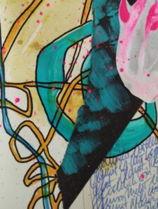Bitte bereit halten: Skizzenheft in deiner Lieblingsgröße mit stärkerem Papier, ein altes Buch – in das direkt reingearbeitet werden kann oder Seiten daraus verwendet werden können, dünne Collagepapiere, Lieblingsstifte/ Farben, gesammelte Schnipsel, Einkaufszettel, Eintrittskarten der letzten Zeit, alles was dir so über den Weg läuft…